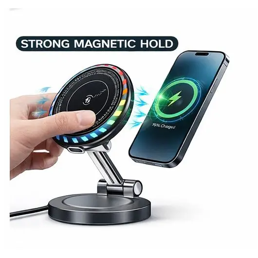 Bu wireless charging magnetic telefon tutacağı avtomobil daxilində telefonun həm sabit saxlanması, həm də eyni anda simsiz şarj olunması üçün nəzərdə tutulmuş müasir aksesuardır. Maqnit texnologiyası sayəsində telefon bir hərəkətlə tutucuya yerləşdirilir və əlavə sıxaclara ehtiyac qalmır.